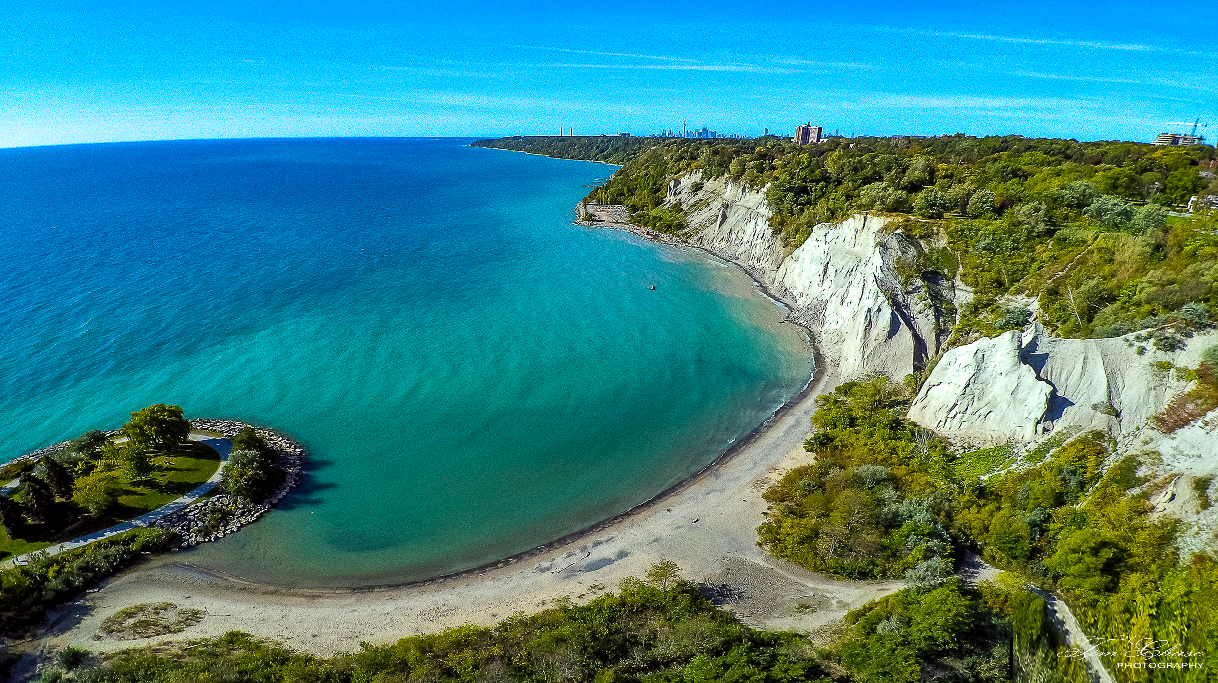 除此之外,世嘉堡安大略湖边还有美丽的Scarborough Bluffs Park悬崖公园。站在悬崖崖顶,远眺安大略湖,白云朵朵,湖水碧蓝,海天一色的湛蓝,沁人心脾,让人心情舒畅,不忍离去。漫步在崖底绵延的沙滩上,观悬崖红遍,听惊涛拍浪,看碧水深处,鱼虾畅游。悬崖下,奇石林立,水漫沙滩,绕过这片怪石滩,峰回路转,眼前出现一弯色彩缤纷的湖面,是一个风平浪静的港湾,海鸟扑飞,白帆点点,让人心旷神怡。