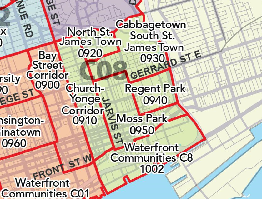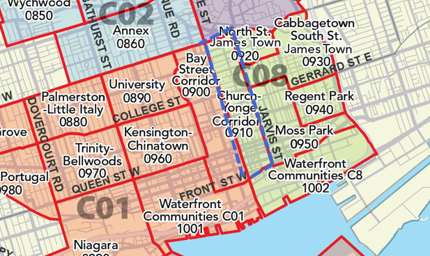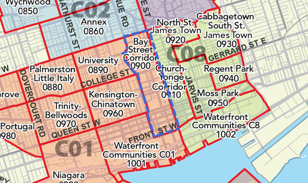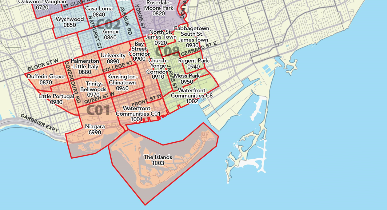 C01和C08区是多伦多的市中心,北面从Bloor St一直到南面的湖心岛 (Toronto Island) ,中间以Yonge街为界,分为C01和C08. 咱们从南向北讲起。