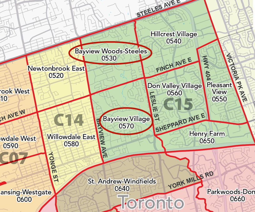 Bayview Wood-Steeles 位于Bayview Village北面,东起 Leslie,北到 Steeles,西到 Bayview,南到Finch.