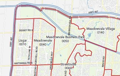 位于密西沙加西北部,是具有一定历史的成熟社区。社区最早是Meadowvale村,是由一批从纽约来的爱尔兰移民于19世纪20年代所建立。早期村里主要以磨坊作业为主,农民们以Credit河里的水力驱动磨床,在19世纪六七十年代生意上取得了极大成功。到20世纪50年代后期,随着401高速公路的修建,Meadowvale开始向外界开放,并于1968年加入密西沙加。从70年代起,Meadowvale的西部农田开始开发修建民宅,这片区域也就逐步发展成为现今的Meadowvale社区。社区人口约为43,000,平均家庭年收入为$86,000. 主要族裔比例为:加拿大裔(14%),南亚(13%),英裔(9%),华裔(7%),波兰裔(7%)。社区人口中拥有大学或大专以上文凭的占60%,主要从事商业贸易,管理,应用技术等方面的工作。