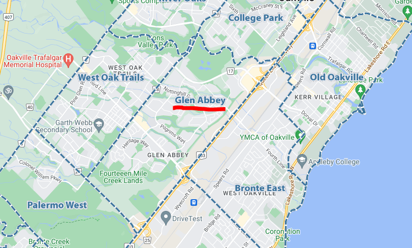 Glen Abbey社区位于Oakville的西北部, 东接16里溪,南接QEW,西接Bronte Road, 北接Upper Middle Road。
