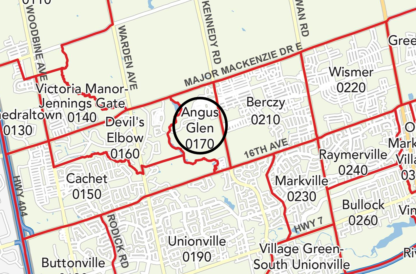地理位置:位于万锦市中北部,北至Major MacKenzie Dr.,南至16街,东至Kennedy Road,西以Bruce Greek为界,近404和407高速,生活便利。