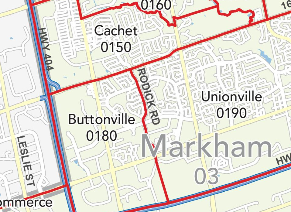 地理位置:社区范围为16街以南,Hwy 407以北,404 以东,Rodick Rd以西。社区东面接壤Unionville 社区, 北面是Cachet 社区。