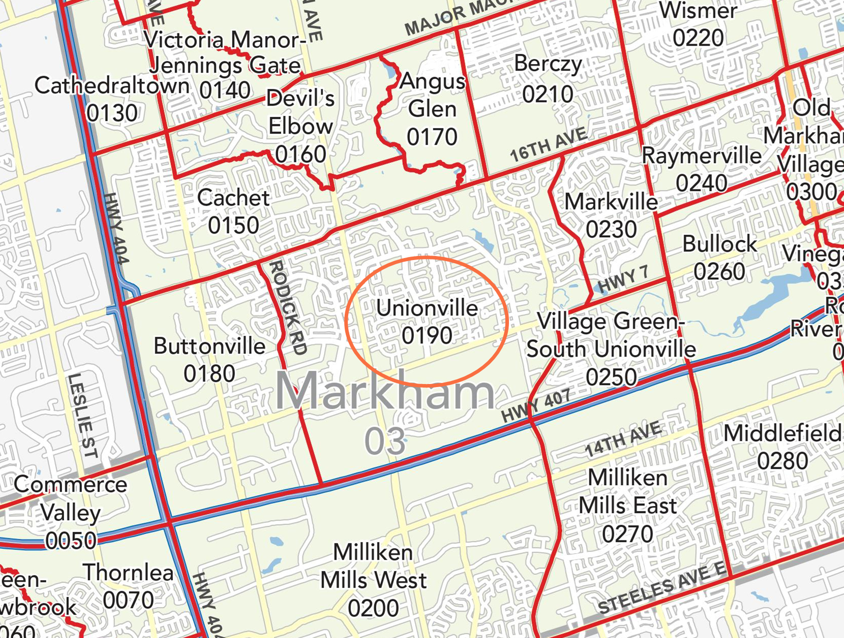 地理位置:区位于万锦市正中心。北起16 街,南至HWY 7,东至Kennedy Road,西至Rodick Road.