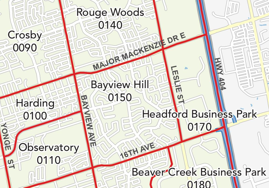 地理位置: 富豪山庄社区处于多伦多上风上水的位置。社区西起Bayview Ave,东至Leslie St,南起16th Ave,北至Major MacKenzie Dr E。