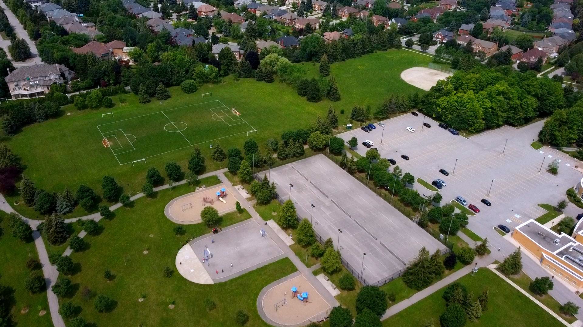社区旁还有多个网球场、棒球场等, 还有Playground以及树木环绕的大片绿地,是晚饭后散步的绝佳场所。