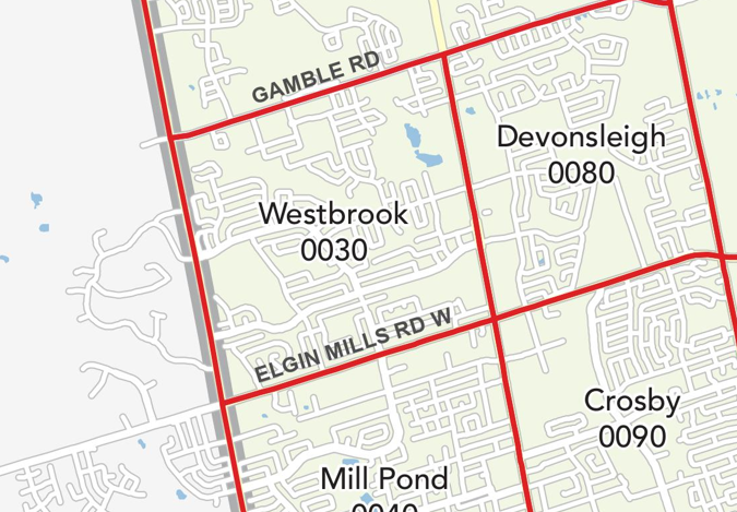 地理位置: Westbrook 社区地处 RichmondHill 的西北部。社区南起 Elgin Mills,北至 Gamble(19th街),西起 Bathurst,东至 Yonge 街。