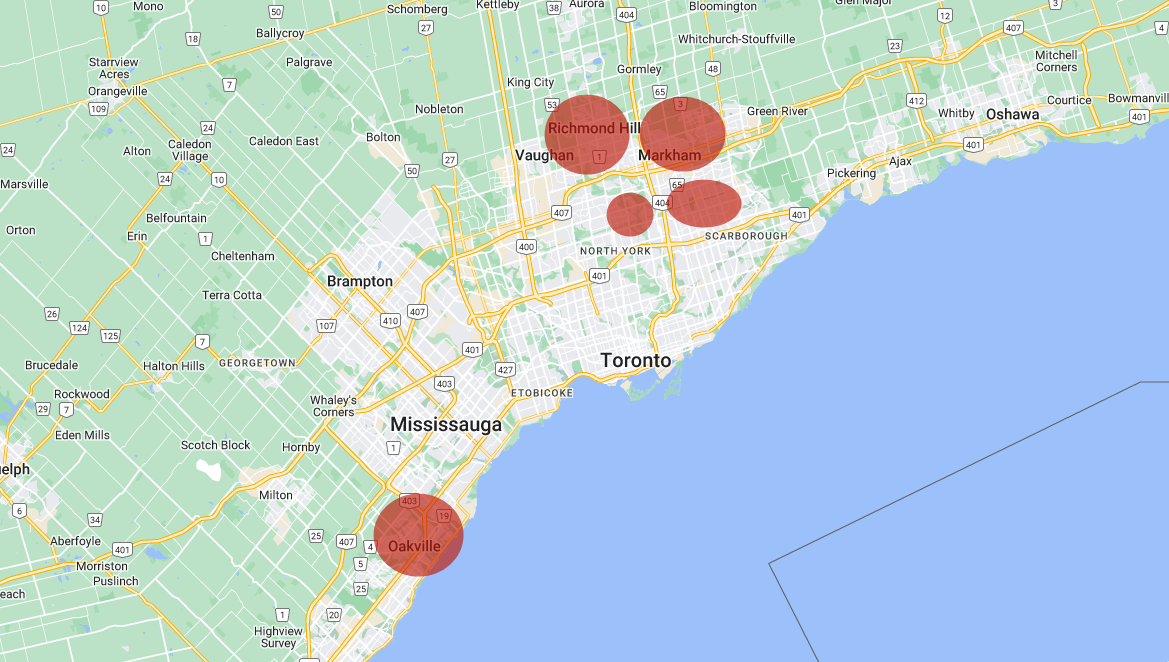 华人分布于多伦多各个地区,最集中的地区要数世嘉堡北部、北约克东部,以及万锦、列治文山、奥克维尔,以及旺市东部,这些地区的华人人口能达35万。在这些华人聚居小区中,华人所占比例可高达70%。