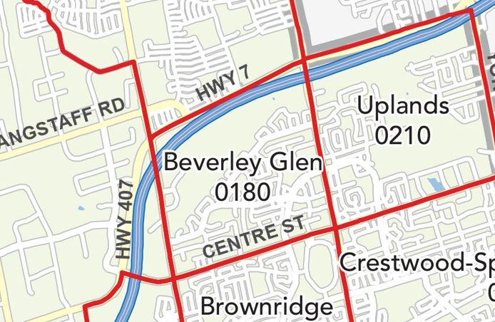 地理位置: Beverley Glen 位于Vaughan 市西南部,位于Center Street 以北,Highway 7以南,Dufferin以东,Bathurst以西,407 高速贯穿其中。
