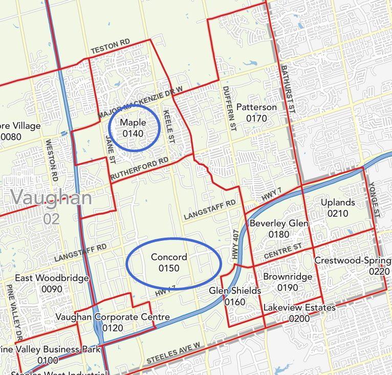 地理位置: Maple位于旺市的中部,南起Rutherford Rd, 北至Teston Rd,西至Jane St和400高速一带,东面与Patterson接壤。