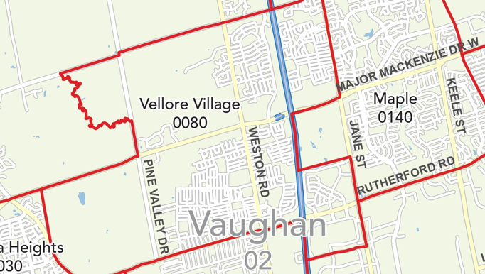 地理位置: Vellore village范围大概在400高速以西,Pine Valley Dr 以东,Rutherford以北,Teston 以南。社区的西部是大片的森林和未开发的自然保护区。区内流淌着数不清的溪流,点缀着很多公园和绿地,自然环境很好。